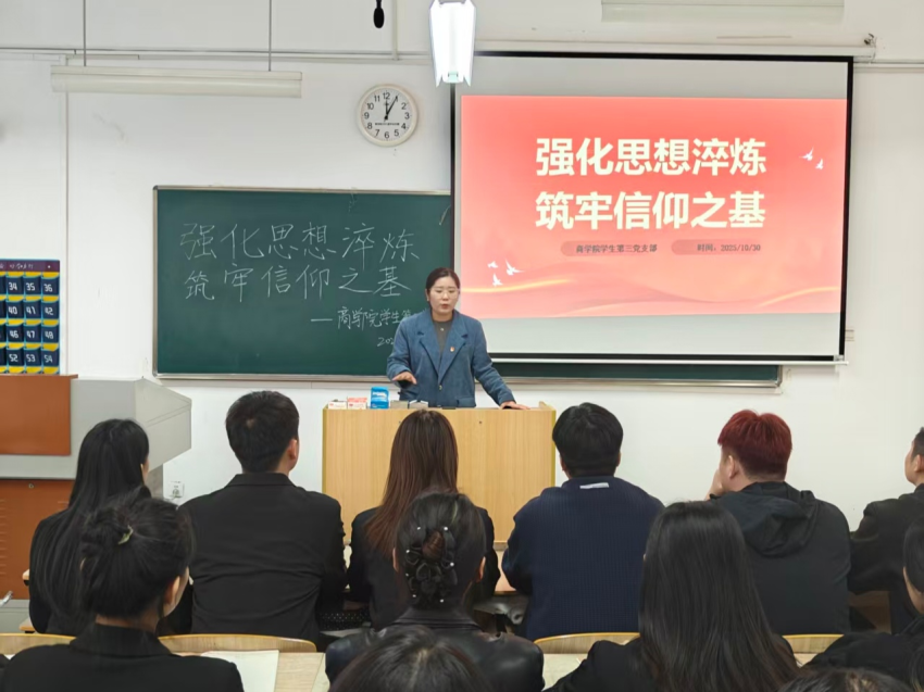 为统一支部成员思想、凝聚奋进力量,引导支部成员夯实信仰根基、强化党性修养。10月30日,商学院学生第三党支部于2号楼320教室开展“强化思想淬炼,筑牢信仰之基”主题党日活动。此次活动由商学院学生第三党支部书记贾克洋主持,该支部全体成员参加。