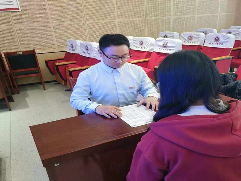 招聘会上,车物查勘定损部古泽明经理首先介绍了中国平安保险公司的发展历程、企业文化、经营业绩以及人才培养理念。接着,古经理推介了中国平安金橙人才计划,阐述了车物查勘定损岗、人伤查勘岗、人伤T团队等拟招聘岗位工作职责和任职资格要求。最后,企业面试官就同学们关心的工作时间、薪资待遇、转岗定编等问题进行现场答疑,并对求职学生进行了初步面试。