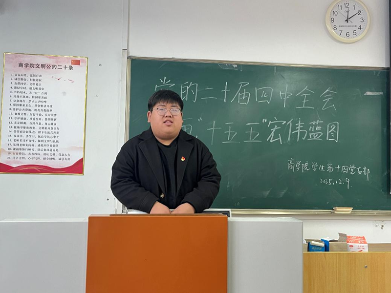 为深入学习贯彻党的二十届四中全会精神,深刻领会“十五五”规划建议的重大意义。12月9日,商学院学生第十四党支部于二号教学楼407教室开展“党的二十届四中全会,擘画‘十五五’伟蓝图”主题党日活动。学生第十四党支部全体成员参加,本次活动由吴树立同志主持。